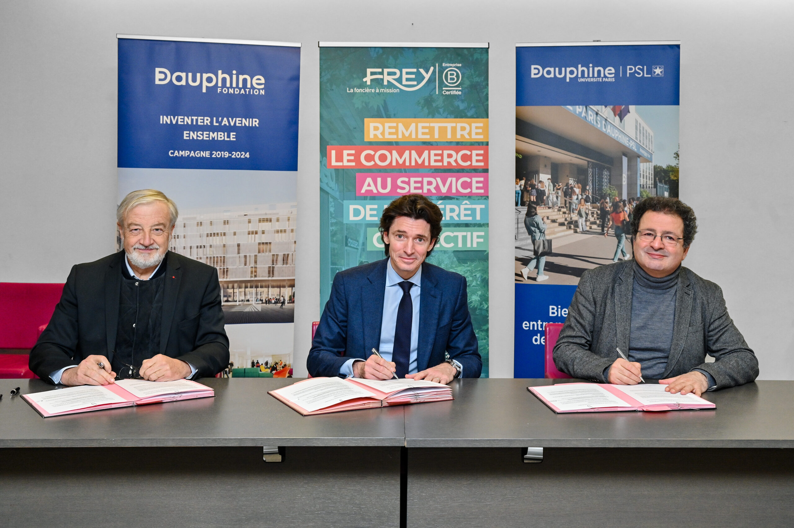 Crédits photo : Université Paris Dauphine-PSL, de gauche à droite Vincent Montagne, Pdt. de la Fondation Dauphine, Antoine Frey, PDG de FREY et E.M. Mouhoub, Pdt de l’Université Paris Dauphine – PSL le 25 janvier 2023